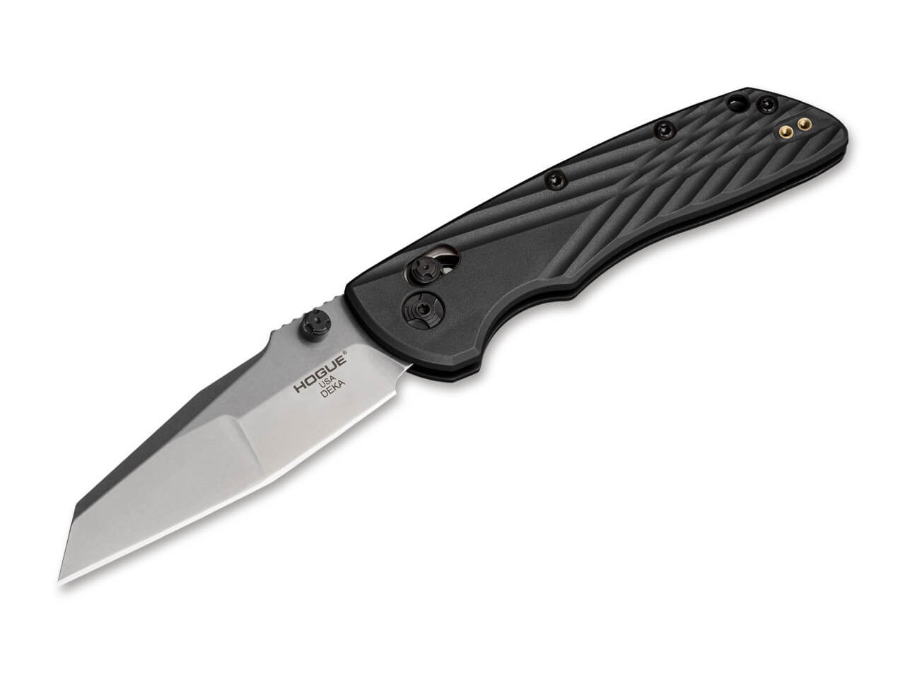 'Die Zahl zehn — „deka“ im Griechischen und „decem“ im Lateinischen — symbolisiert seit jeher Harmonie, Ordnung und Vollkommenheit. Designer Allen Elishevitz präsentiert das Hogue Deka, ein ultramodernes Taschenmesser, das für Rechts- und Linkshänder gleichermaßen geeignet ist und das Ideal beidhändiger Balance verkörpert. Beidseitige Daumenpins setzen die Wharncliffe-Klinge frei, die aus CPM MagnaCut-Pulvermetallurgie-Stahl geschmiedet ist, und ein beidseitig bedienbarer ABLE-Slider-Lock sichert die Klinge für eine sichere Anwendung. Der strukturierte schwarze Polymergriff reduziert das Gewicht und bietet zugleich einen sicheren Alltagsgriff; das Messer verfügt über eine Lanyard-Öse und einen umsteckbaren, nach oben gerichteten Taschenclip.'