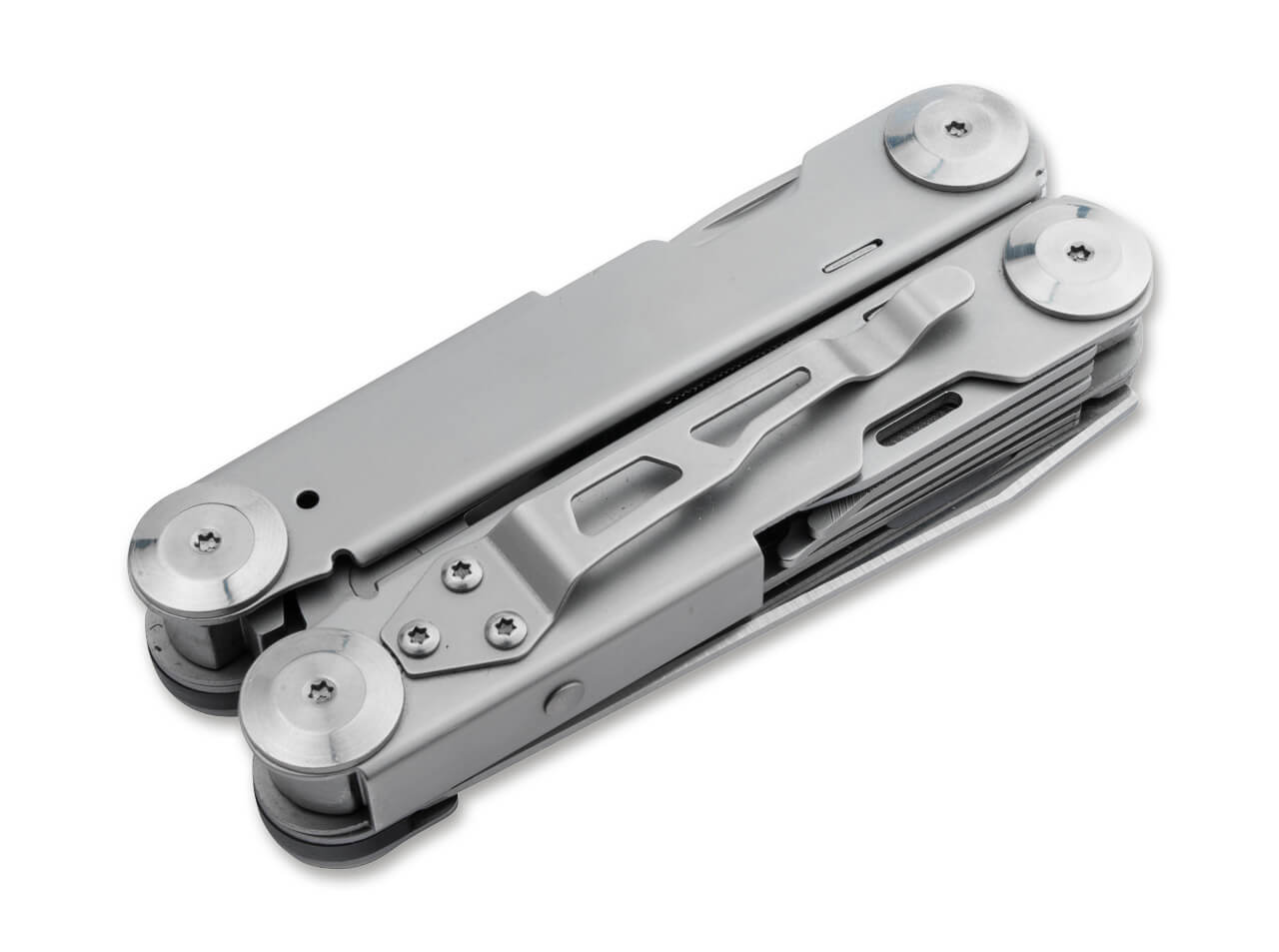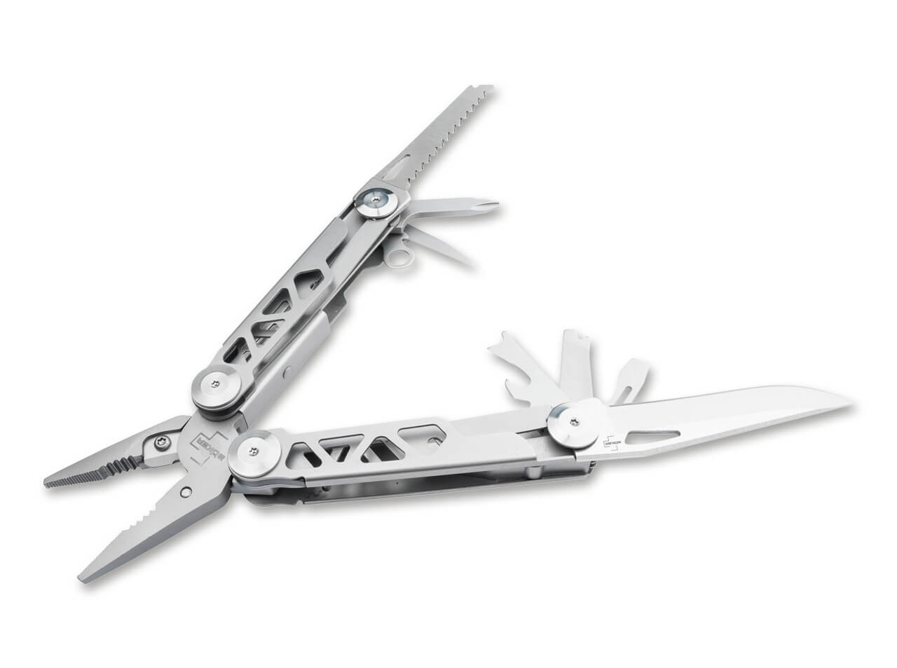 'Ausgestattet mit einer Reihe praktischer Werkzeuge ist das Boker Plus Specialist Pro ein vielseitiges Multitool mit federunterstützter Kombizange und einem verstärkten, austauschbaren Drahtschneider, der auch hohen Belastungen gewachsen ist. Neben einer flachen Greiffläche verfügt die Zange über eine Öffnung zum Greifen von Sechskantbolzen, Überwurfmuttern und Rohren. Die in den beiden Hälften des Edelstahlgriffs untergebrachten Werkzeuge öffnen sich geschmeidig und arretieren sicher. Zum Werkzeugset gehören eine glatte Klinge, eine Holzsäge, ein Dosenöffner, ein Flaschenöffner, ein Drahtbieger/-abisolierer, eine Näh- und Bohrahle, ein Kreuzschlitzschraubendreher, ein Flachschraubendreher und eine Metallfeile. Der Edelstahlgriff hat dekorative Aussparungen; das Multitool verfügt außerdem über eine Öse für eine Trageschlaufe (Lanyard), einen Taschenclip sowie eine hochwertige Nylontasche für den Gürtel.'