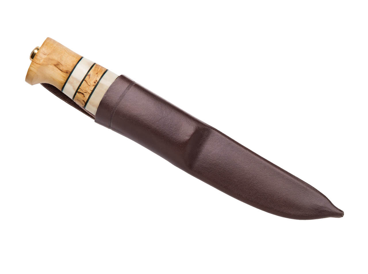 'True to its name—Arv, Norwegian for "heritage"—this knife is built to be handed down through generations, crafted using traditional techniques. A versatile lifelong companion, it handles cutting tasks with ease. The medium-length handle is made from carefully selected, bush-hammered curly birch, accented with leather and stag horn. The blade uses high-quality, three-layer Helle steel with a Scandinavian grind, and a small but distinct finger guard adds extra safety. Each knife comes with a brown, Nordic-inspired leather sheath made from genuine, premium leather and fitted with a belt loop for secure transport; its compact size also makes it ideal for wearing on a belt like a classic neck knife.'