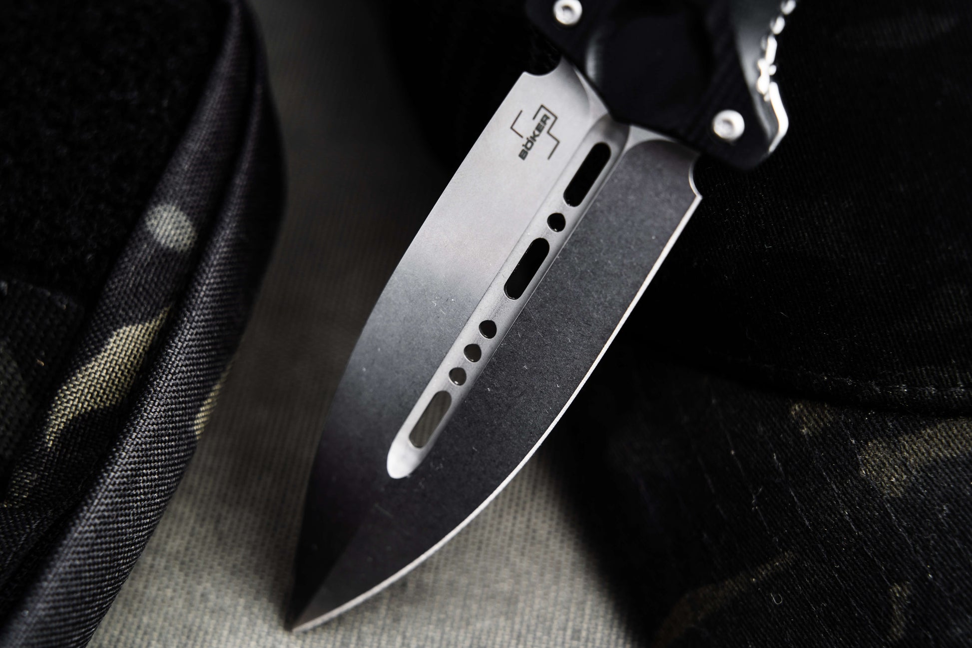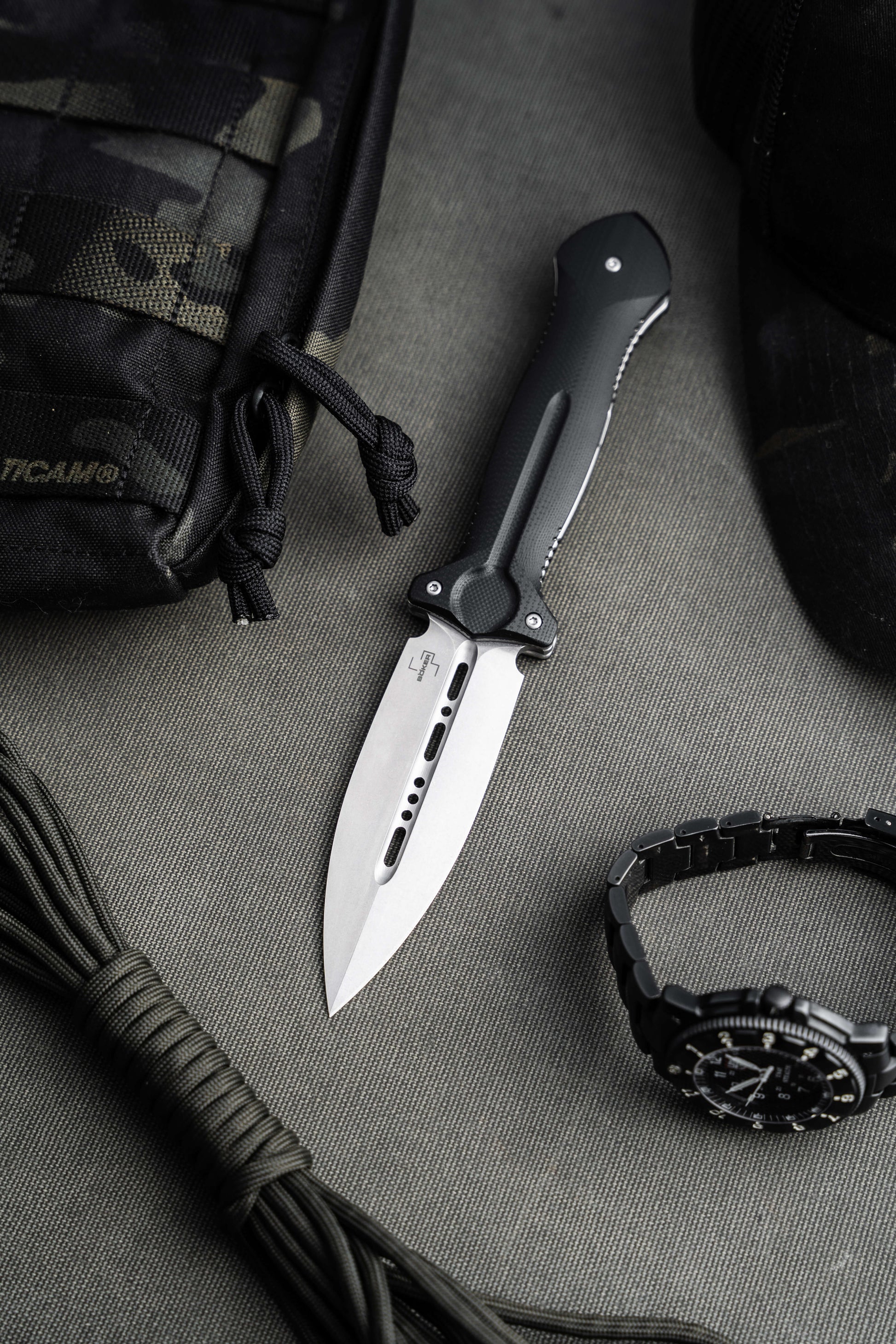 'Choose the Cheus. Designed by Alexey Ponomarev of Brutalica, the substantial Boker Plus Cheus makes selecting a knife easier. Its tactical-dagger silhouette gives this pocketknife a dynamic presence. The VG10 spearpoint blade features a single-sided grind, stonewash finish and weight-reducing cutouts in the hollow grind, runs on ball bearings for smooth deployment and delivers excellent edge performance. When open, the flipper tucks completely into the handle for a clean profile. Ergonomic, non-slip G10 handle scales include jimping on the top and bottom for a secure grip, and a central recess that mirrors the blade’s hollow grind. A neatly integrated liner lock keeps the blade firmly in place for tough cutting tasks. Supplied with a right-side tip-up clip and a high-quality nylon pouch.'