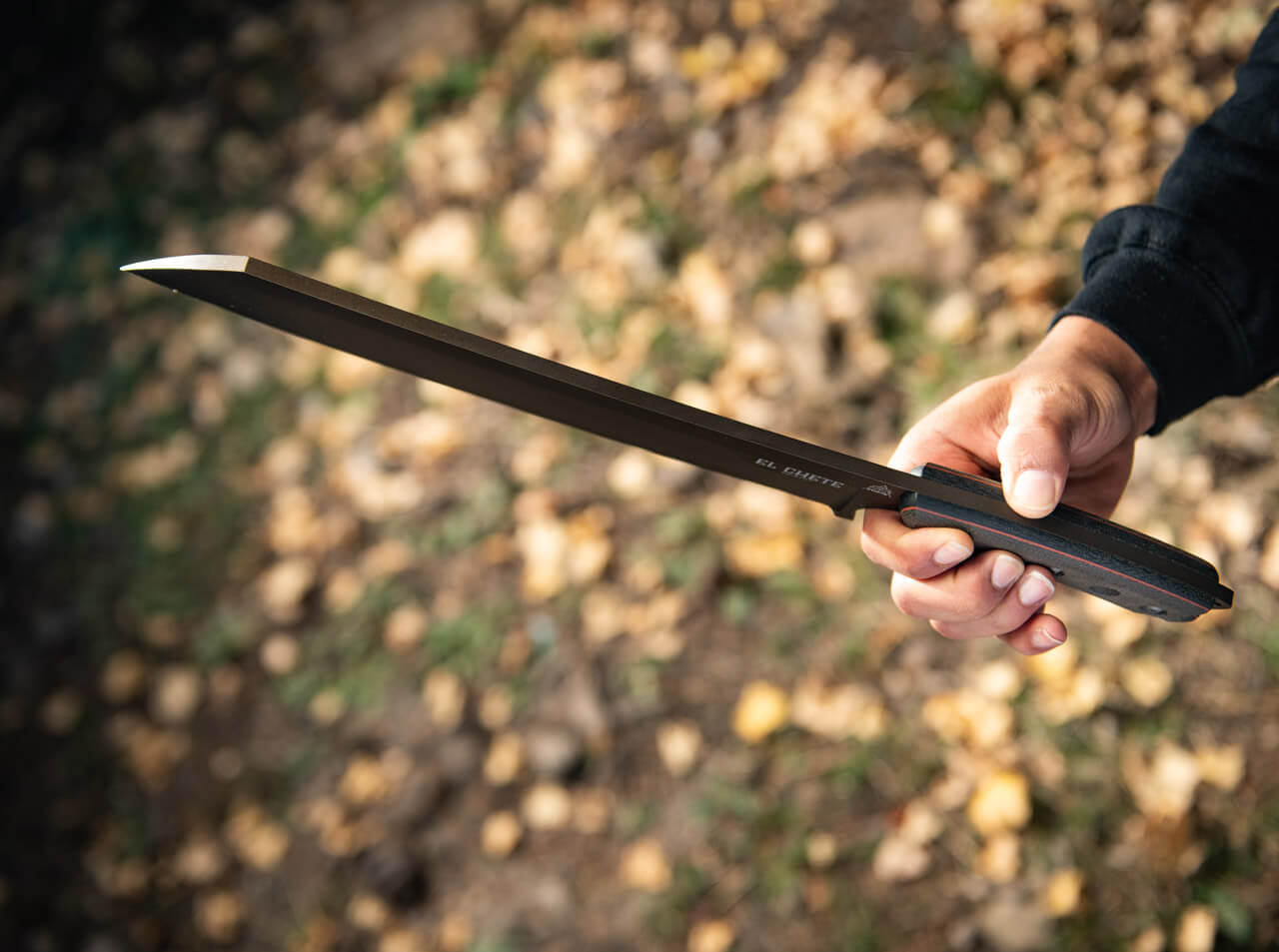 'The El Chete is a chopping knife with almost frightening power. Despite its compact design, the 6.4 mm-thick blade delivers massive momentum and can sever even sturdy branches with just a few chops. The solid 1095 carbon steel construction is finished with an Acid Rain coating, giving each piece a unique appearance. The black-and-green Micarta handle with an orange spacer fits comfortably in the hand for fatigue-free use. A custom Kydex sheath includes a leather loop for maximum freedom of movement, and the knife has dual lanyard holes.'