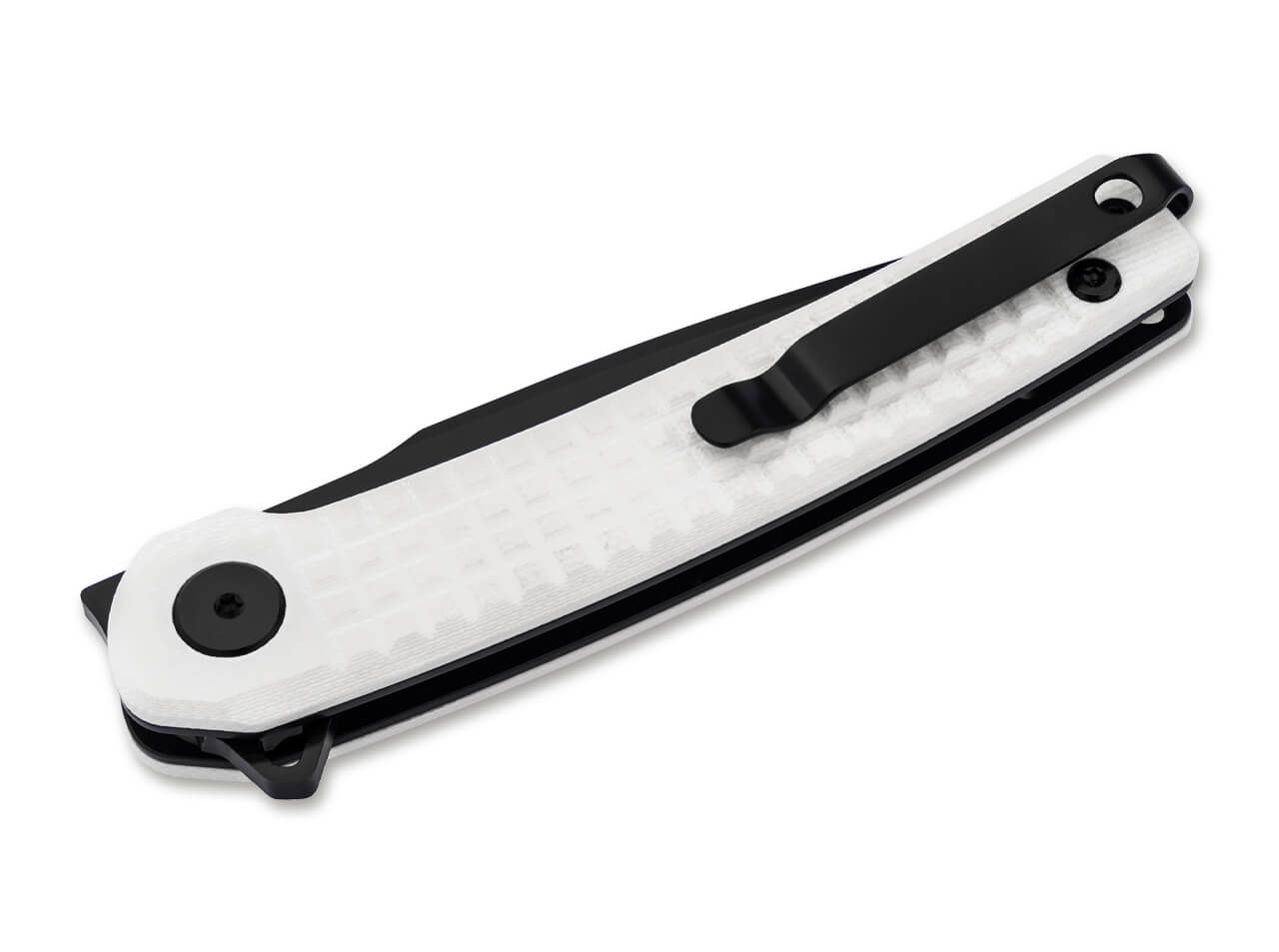 'Radiant and refined, the Boker Magnum Imperial White Liner presents itself as a sophisticated gentleman’s folding knife for everyday carry and leisure. Its striking black-and-white contrast on blade and handle captures every shade of grey in the EDC spectrum, delivered with Boker’s characteristic ease. The black-finished 440B ball-bearing drop-point blade offers a discreet yet confident look, while the textured G10 handle combines secure grip with polished style. The knife opens via a flipper or front flipper and is locked by a liner lock for reliable performance. Includes a lanyard hole and a reversible tip-up clip for deep carry.'