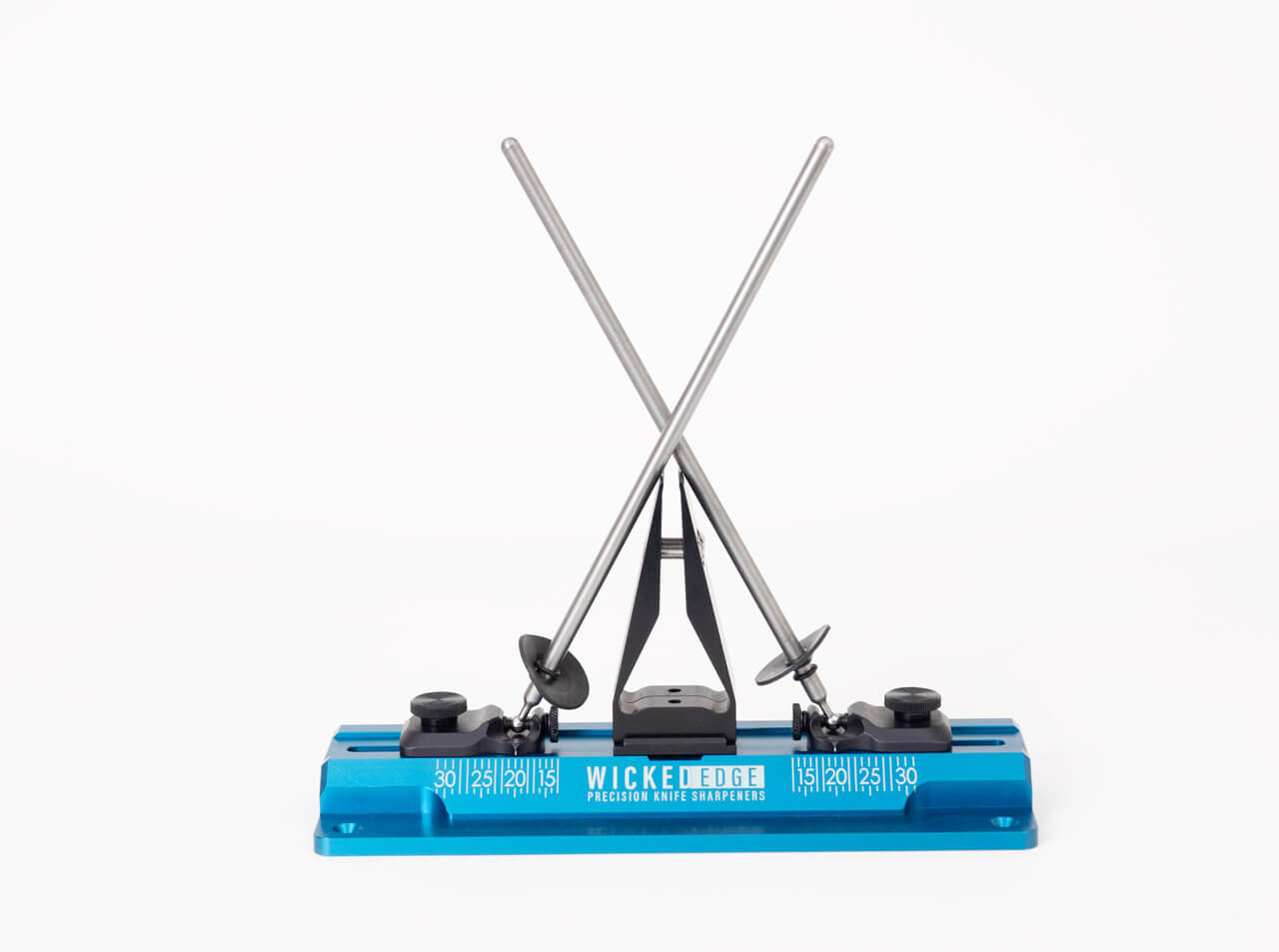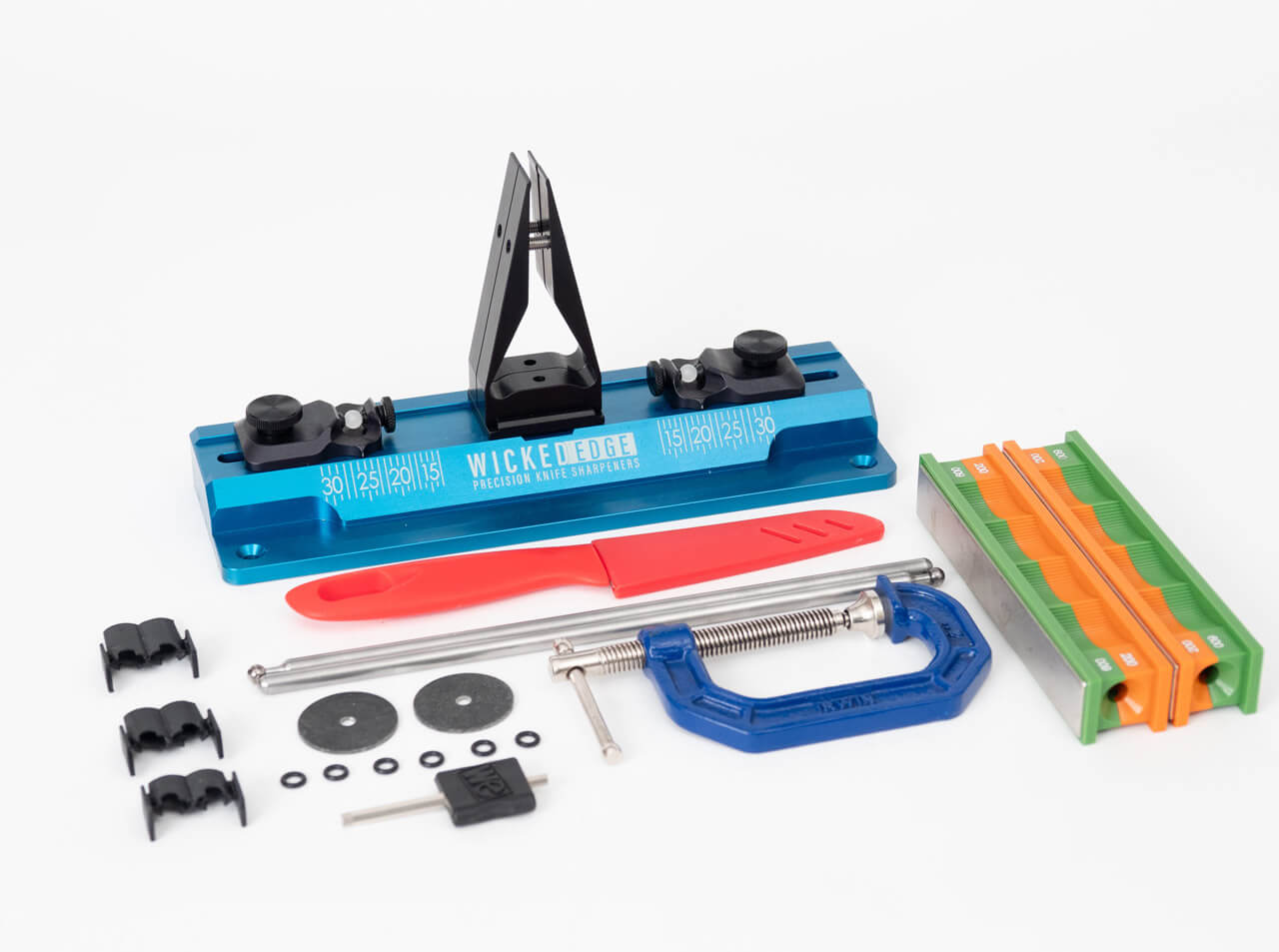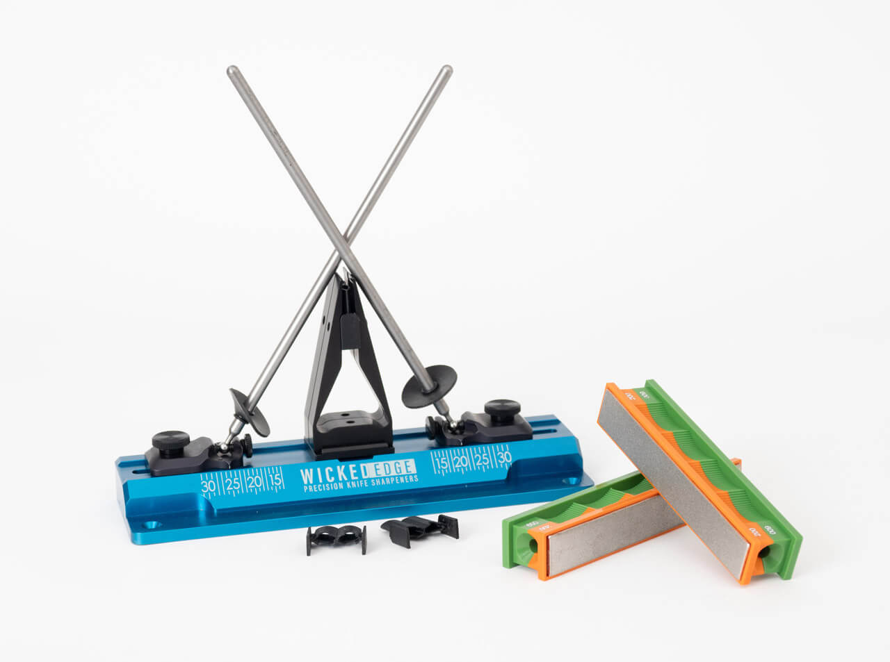 'Achieve professional sharpening with the Wicked Edge GO (WE60) Precision Knife Sharpener. This compact, portable unit suits both beginners and experienced sharpeners, delivering consistently sharp edges at home or on the go. The redesigned standard vise securely clamps flat-ground and distal-taper blades commonly found on kitchen and pocket knives. Angle settings range from 13° to 31° per side (26°–62° total) in 1° increments for precise edge control. It includes premium 200/600 grit monocrystalline diamond stones for efficient material removal. Weighing just 1.6 kg, the sharpener is easy to transport and store. Mounting options include the supplied C-clamp for any flat surface or direct attachment using pre-drilled holes. Made in the USA from high-quality materials for durability and long life.'