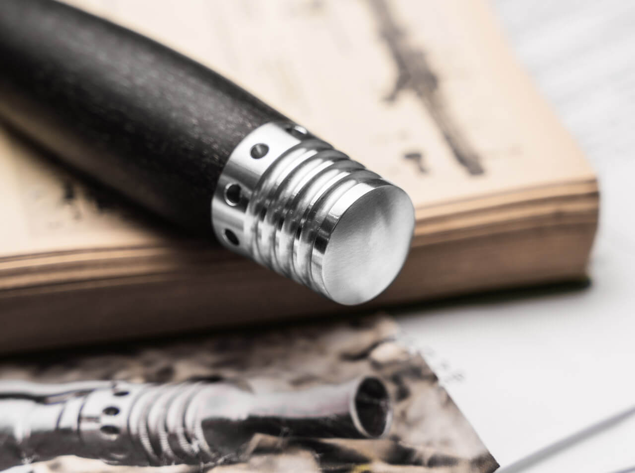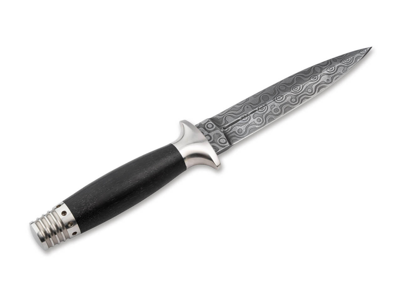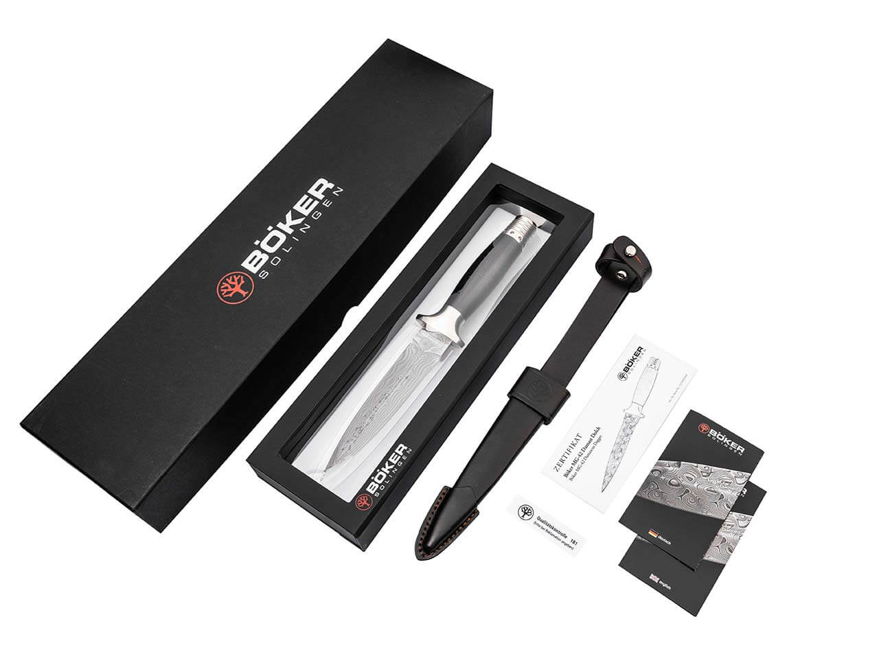 'The classically elegant Boker MG-42 Damascus Dagger adds another jewel to Boker’s line of Damascus steel creations. Inspired by the historic MG-42 machine gun—renowned for its revolutionary stamped-sheet-metal production, exceptional reliability, lightning-fast rate of fire and simplified mass-production design—the dagger echoes that heritage in form and detail. The original MG-42 was developed as a successor to the complex-to-produce MG-34: engineer Werner Gruner of the Johannes Großfuß factory led the redesign to prioritize manufacturability using sheet-metal stampings and fewer machined parts, producing a weapon more reliable and far quicker to build. Its features—rapid barrel changes, a cam-controlled roller shutter, and a raw cyclic rate of about 1,500 rounds per minute (later reduced to roughly 700 rpm by adding mass to the breech)—helped make the MG-42 a defining design; in modified form it remains in service as the German Army’s MG 3. Original wartime MG-42s command prices around USD 40,000–60,000 at Rock Island Auctions.\n\nThe dagger’s blade is forged by long-time partner Chad Nicols from Damascus steel into a double-edged form with subtle fullers on both faces. The chosen Low Layer Raindrop pattern (40 layers) is beautifully highlighted by the blade’s symmetric profile. The guard (toggle) and pommel are solid stainless steel; the pommel incorporates the cooling-fin and gas-outlet motif of the MG-42’s recoil amplifier—a decorative nod to the firearm that also improves grip in the reverse hold. The guard and pommel joinlessly enclose a turned, barrel-shaped roll of hornbeam wood that naturally centers in the hand.\n\nThe dagger comes with a high-quality dark-brown leather sheath featuring a belt loop and reinforcement, and is presented in an elegant frame case that gives a floating display effect. Each piece is delivered with a certificate of authenticity and an individual serial number.'