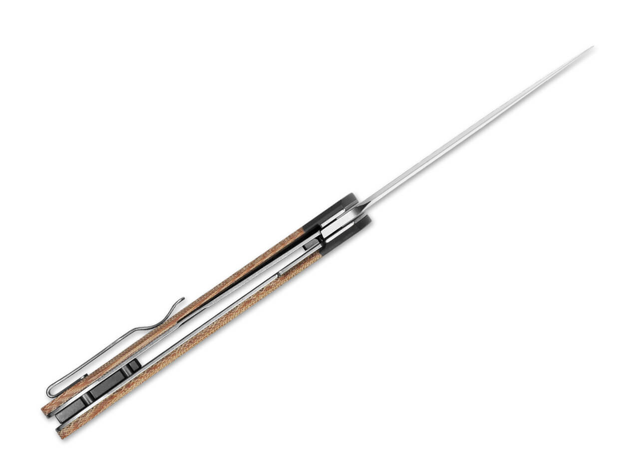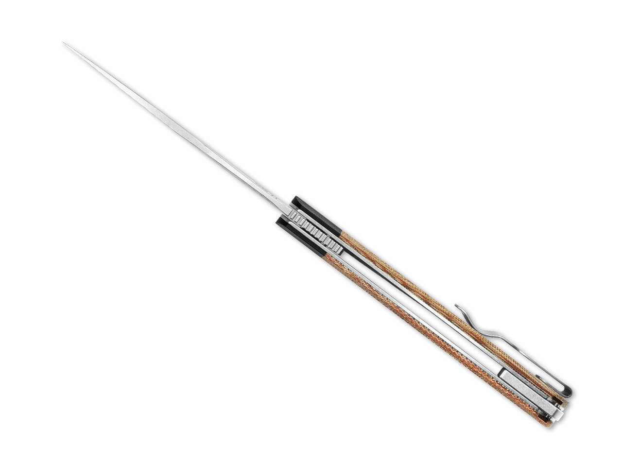 'Designed by Vladimir Legachev, this full-size knife is comfortable to grip even for larger hands. Its look is inspired by Japanese Kiridashi knives, resulting in a sleek, modern appearance with clean lines. The handle pairs a G10 front bolster with brown Micarta scales. The 154CM blade deploys with a flipper and locks with a liner lock. It comes with a right-handed tip-up pocket clip.'