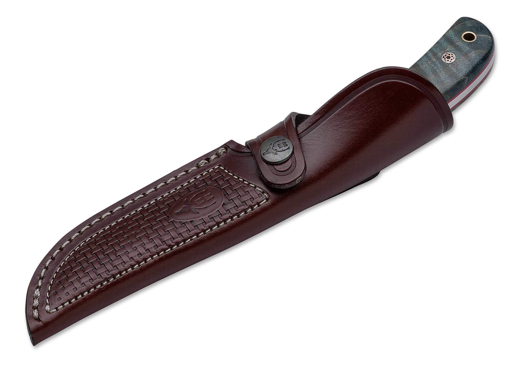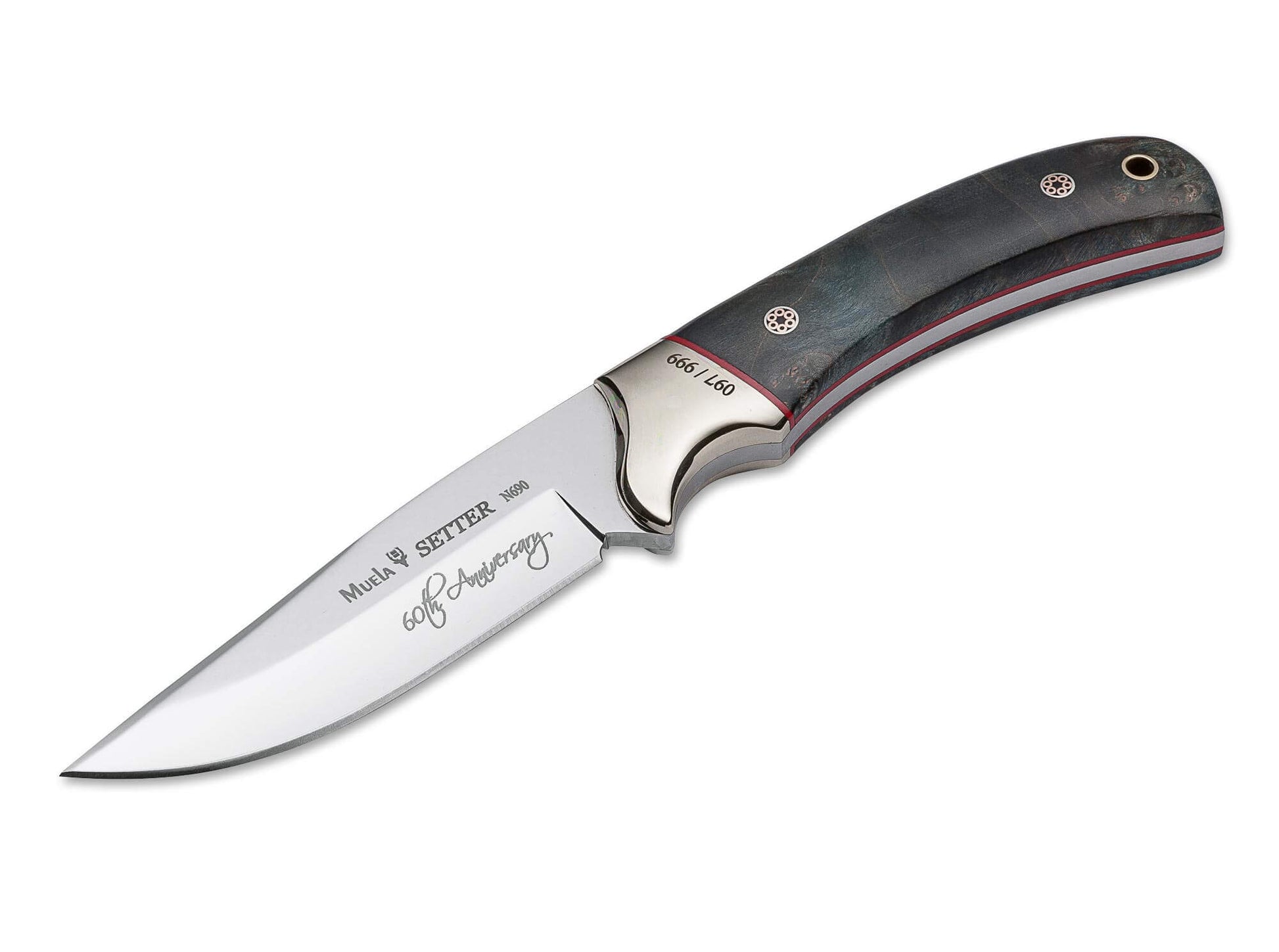 'Muela, known for high-quality hunting knives made in Spain and strong vertical integration, has become a staple for both classic and modern hunting blades—and increasingly for outdoor and bushcraft knives. Their ability to produce stag handles at a consistently high level is unmatched, and the use of modern steels, such as nitrogen-alloyed Sandvik 14C28N on select models, shows they respect tradition while responding to market demands. Muela also manufactures premium leather sheaths in-house.\n\nTo mark their 60th anniversary, Muela released several limited-edition models in specially selected materials, presented as premium editions in collector’s boxes. The Setter Anniversary features blue stabilized maple burl handle scales with two decorative mosaic pins set into red fiber liners. The blade is made from Böhler N690, and the nickel-silver bolster is engraved with a unique serial number while the blade bears an anniversary laser engraving. Each collectible ships with a leather sheath and is limited to 999 copies worldwide.'
