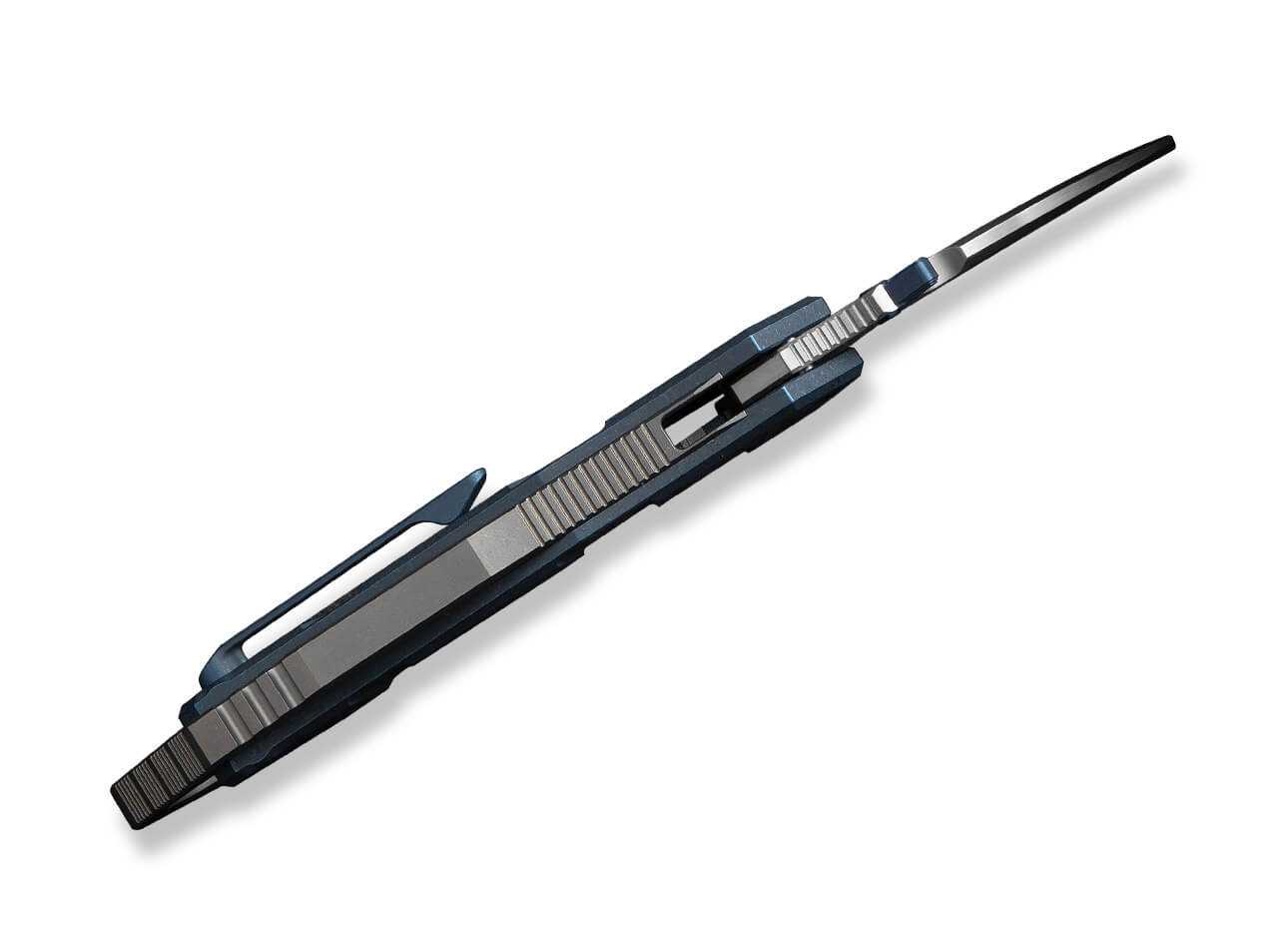 'The WE Knife Tayra is a compact, high-performance karambit folder known for its distinctive design and excellent craftsmanship. Its Bohler M390 blade offers exceptional edge retention and a flat grind for precise cutting, while the satin finish provides a refined, eye-catching appearance. The blue handle is made from durable 6AL4V titanium, giving the knife a premium look and long-lasting strength. An integral back spacer and a signature grey ring add a subtle color accent that complements the overall design. A secure frame-lock mechanism ensures reliable, stable lockup.'