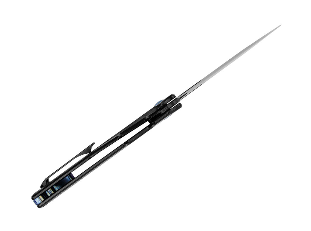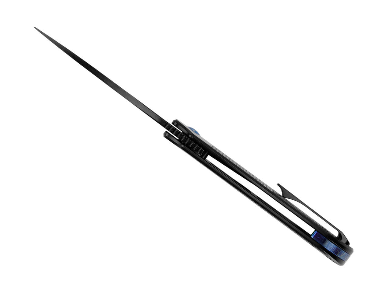 'A study in form and function, the Kizer Varatas is a bold statement of design, performance, and passion. Its CNC-milled black titanium handle is striking and richly detailed, with triangular motifs that contrast beautifully with a square, blue-anodized blade pivot screw, appealing to both hand and eye. An integrated frame lock secures the high-performance powder-metallurgical CPM-S35VN blade, which opens smoothly via a thumb hole. It includes a reversible, tip-up clip machined from solid titanium.'