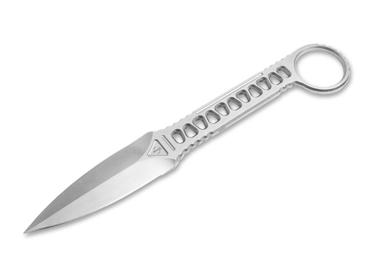 'The lightweight Boker Plus Voodoo features a double-edged 440C dagger blade and performs as a reliable tactical knife in the field and for everyday use. Peter Fegan’s signature skeletonized construction gives it a tactical look while reducing weight in the robust all-steel build, finished with a subtle stonewash. A large handle ring with pronounced jimping in key areas provides exceptional control. The dagger comes with a Kydex sheath and belt adapter, and its slim, lightweight design also makes it suitable to wear as a large neck knife.'