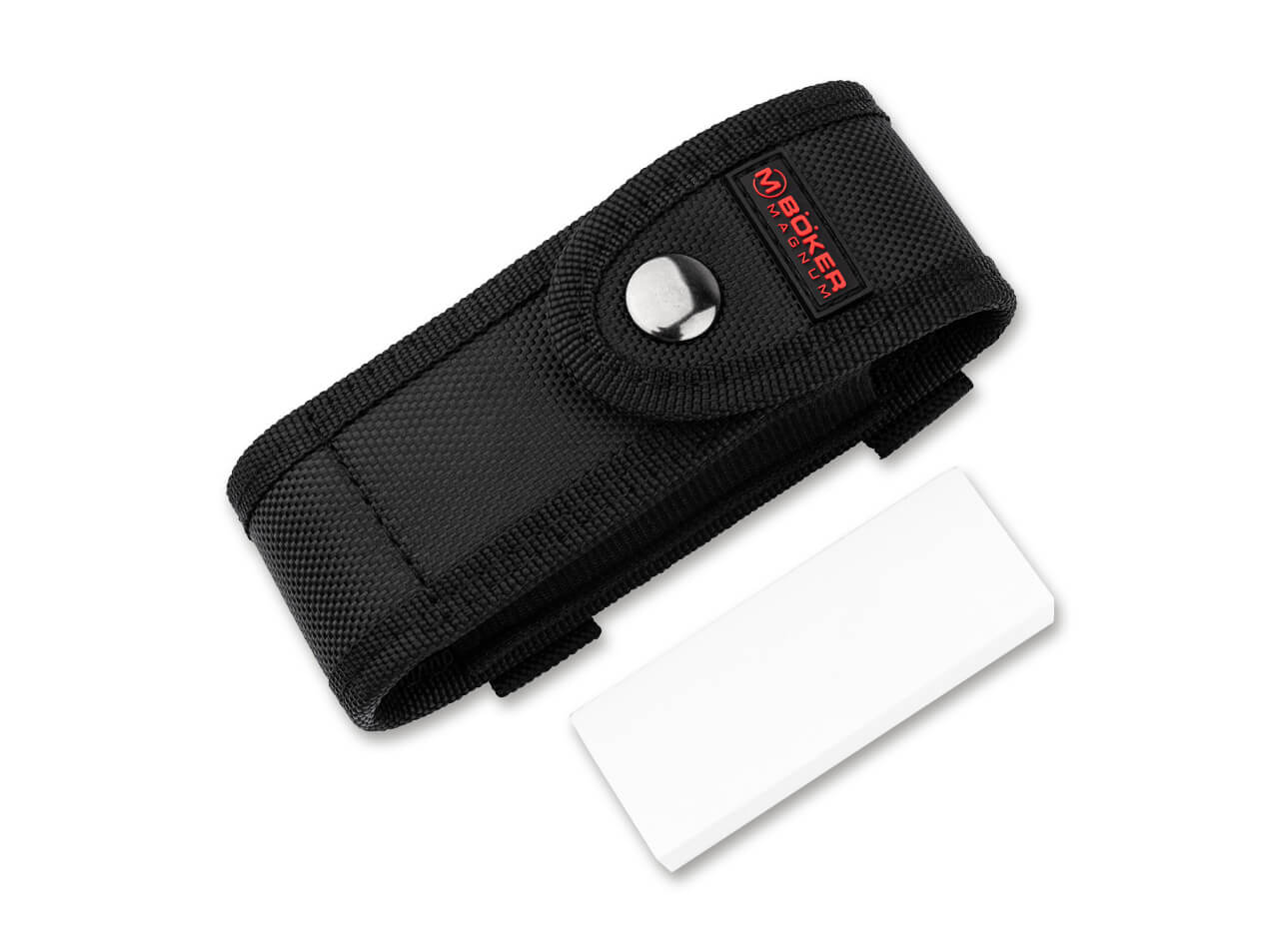 'The Magnum Blomkvist is a compact, fully equipped pocket knife with three functions: a blade, glass breaker, and belt cutter. It includes a nylon belt sheath with an extra pocket for a whetstone. The titanium-coated 440A stainless steel blade opens by flipper or thumbstud and is secured by a sturdy linerlock. Mediterranean olive wood handle scales give the knife a warm, natural look that contrasts with the modern carbon-style bolsters. The premium sheath can be worn vertically or horizontally on the belt, and the knife also features a deep-carry, tip-down clip for added carry options.'