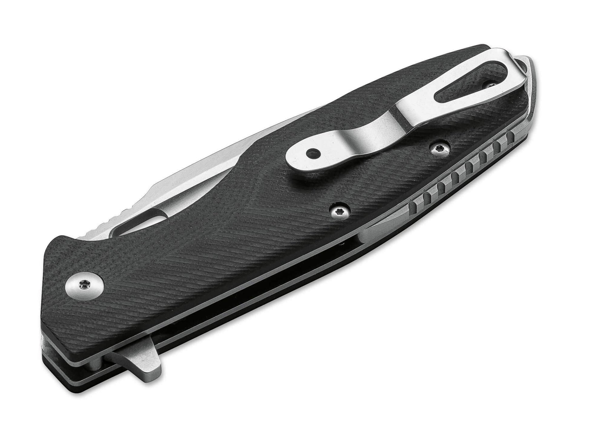 'The Boker Plus Caracal Folder is a modern, rugged utility knife that combines exceptional durability with excellent ergonomics. Its three-tier G10 handles are mounted on solid stainless steel liners, and the strategically placed grooves ensure secure handling even when changing grips. The D2 steel blade has a stonewash finish and rides on ball bearings for smooth deployment via the flipper. The reversible (left/right) pocket clip keeps the knife secure in your pocket. The liners end in a reinforced impact element with an integrated lanyard hole, and exposed jimping adds extra traction. A versatile everyday tool, it comes with a high-quality nylon storage pouch.'