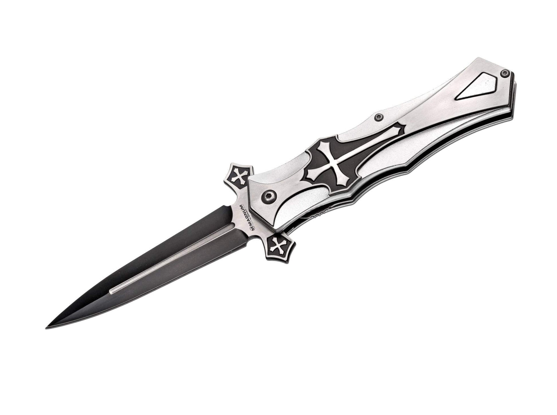 'The Magnum Crusader is a striking pocket knife that guarantees an eye-catching look. Its 440A stainless steel blade sports an elegant two-tone finish and locks with a liner lock. The pronounced, double-sided handguard is decorated with crosses, as is the handle, which is made from lightweight yet sturdy aluminum. It includes a pocket clip for securing to a pocket or gear.'