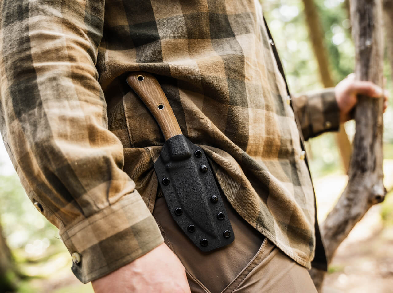 'The Boker Plus Little Rok by James Helm is built for everyday carry and field use, offering excellent balance, ergonomics, and durability. James Helm, a Texas custom knifemaker who grew up on a ranch, began designing knives soon after high school and has worked full-time as a maker since 2009, focusing on designs for outdoor enthusiasts as well as police and military users. The robust drop-point blade is made from SK-85 steel, features an abrasion-resistant black powder coating, and is full-tang for reliable strength under heavy use. The contoured brown micarta handle has fine texturing for a secure grip and supports a variety of comfortable hold positions; its ergonomic shape also allows quick transitions to reverse or back grips. The signature hollow rivets double as a lanyard hole. The knife comes with a custom-fit Kydex sheath and a practical belt adapter.'