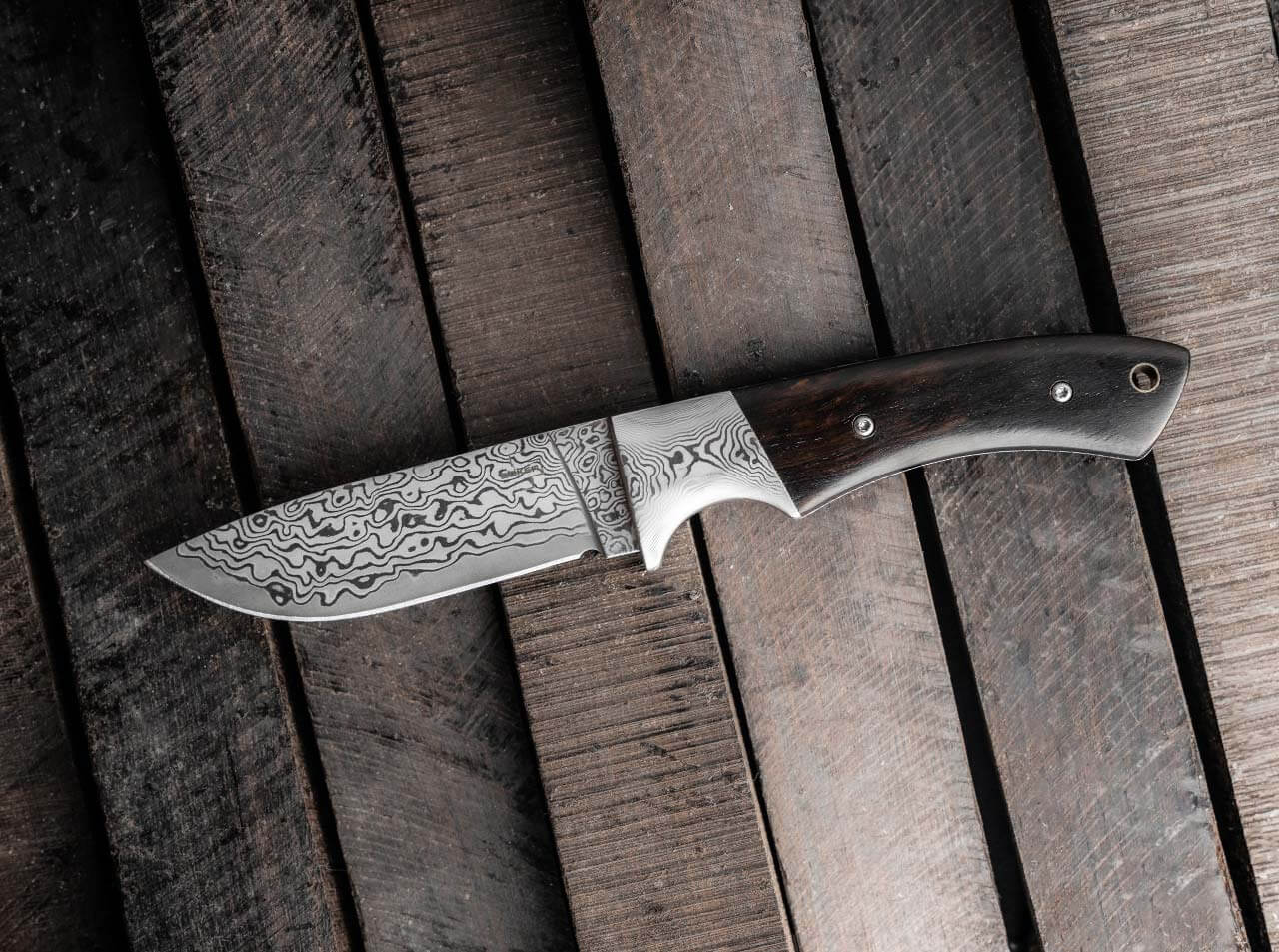 'History starts with a vision that can reach into the past and shape the future. A shared heritage of quality, precision and dedication links the two historic German firms Boker and Mauser. Best known for military arms like the Model 98, Mauser has focused in recent years on hunting rifles and outdoor equipment. More than 25 years ago the M‑1 was created as a classic hunting knife; the Boker Plus M‑One Damascus revives that concept, reinterpreting the fixed‑blade silhouette as a modern tribute to discerning hunters and collectors. Its drop‑point blade of 67‑layer Damascus blends an elegant appearance with uncompromising performance. A solid tang and an ergonomically shaped handle of rich, earthy ebony ensure strength and comfort. Large bolsters echo the blade’s Damascus motif, adding intensity to the design, and a hollow brass stud in the handle allows attachment of a lanyard in a traditional style. The knife is delivered in a high‑quality leather sheath.'