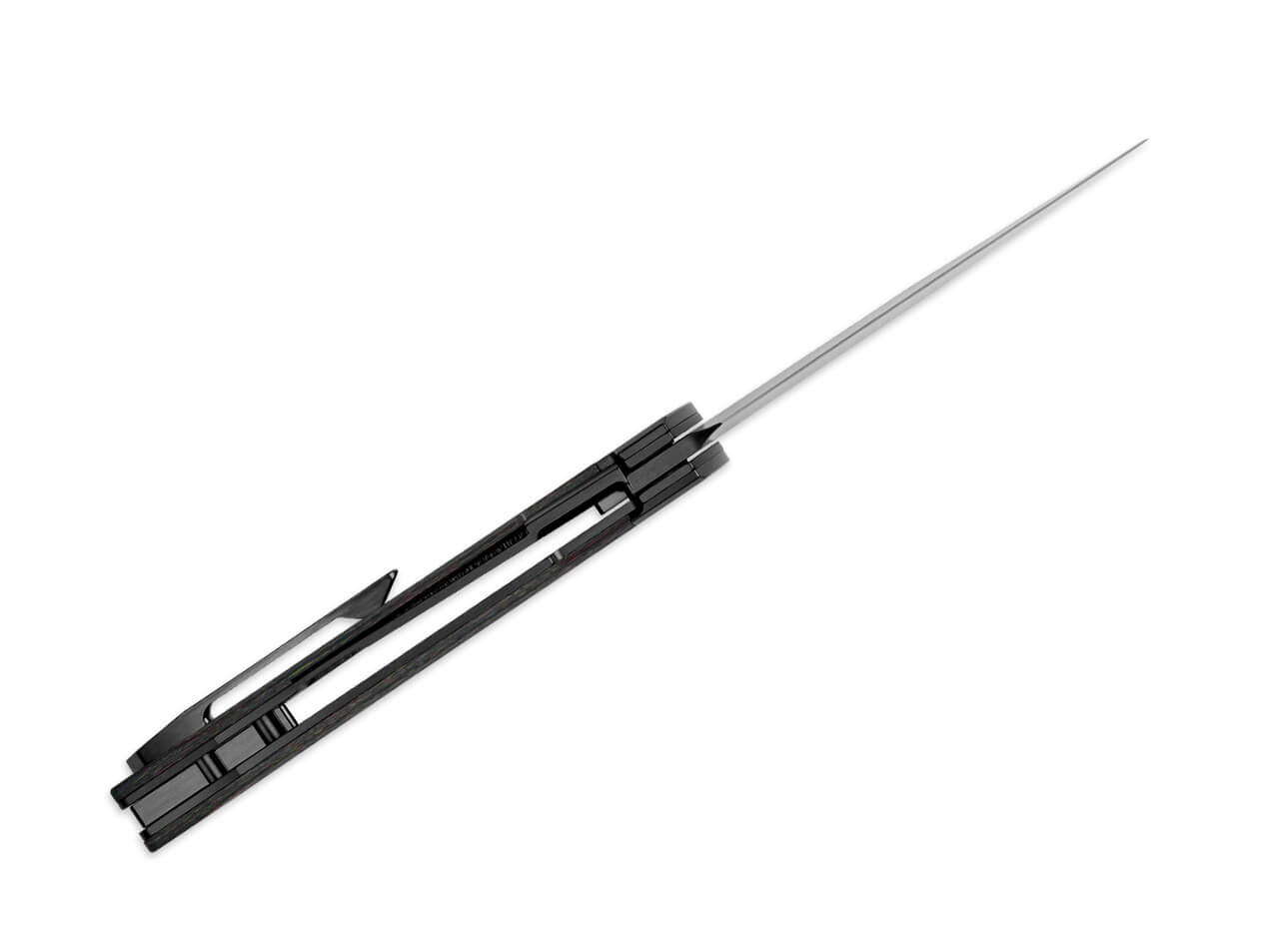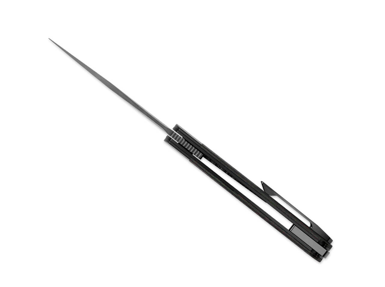 'Designed by Vladimir Legachev, this compact knife pairs high-quality construction with modern styling. Inspired by Japanese kiridashi knives, it offers a slim, refined profile with clean lines. The handle combines a black titanium front bolster with a carbon-fiber body that has a subtle 1980s shimmer. The DLC-coated blade is made from powder-metallurgical CPM S35VN, deploys via a front flipper, and locks with a liner lock. It includes a right-side tip-up clip and a lanyard hole.'
