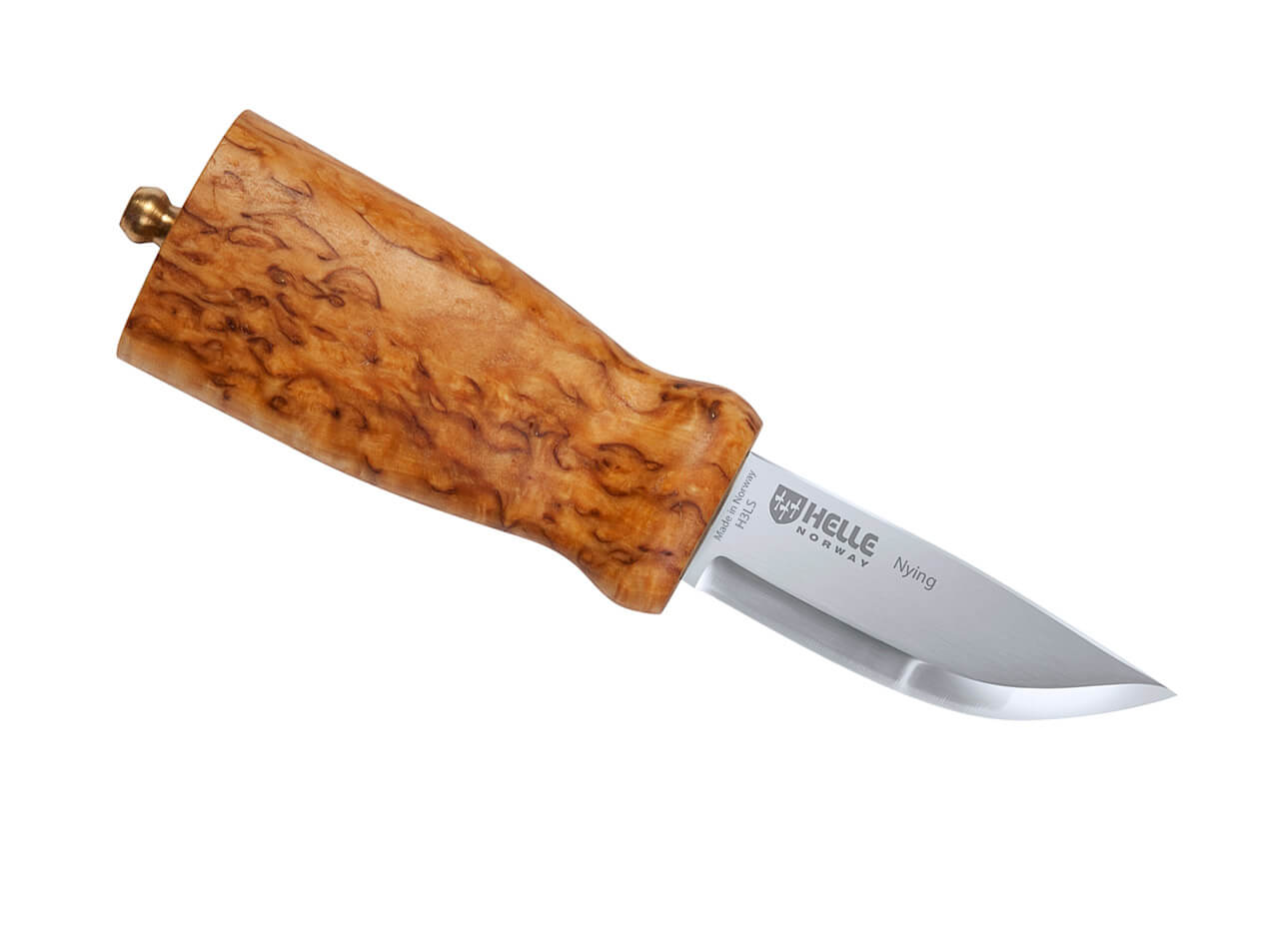 'Since 1977 the Helle Nying has been a steadfast belt companion — a knife that has earned awards for its distinctive, classic design and occasionally divided opinion. More than a million have been produced. The generously sized handle provides a secure grip and precise blade control, while a subtle finger recess keeps the hand safely positioned even when working near the edge. The Nying is made for deliberate, slow work — ideal for carving and lingering tasks. It comes in an elegant leather sheath with a flame-shaped cutout; a retaining strap folds over the pommel to lock it in place. Using the traditional Norwegian leather carrying system, the knife hangs loosely from the belt and is always within reach.'