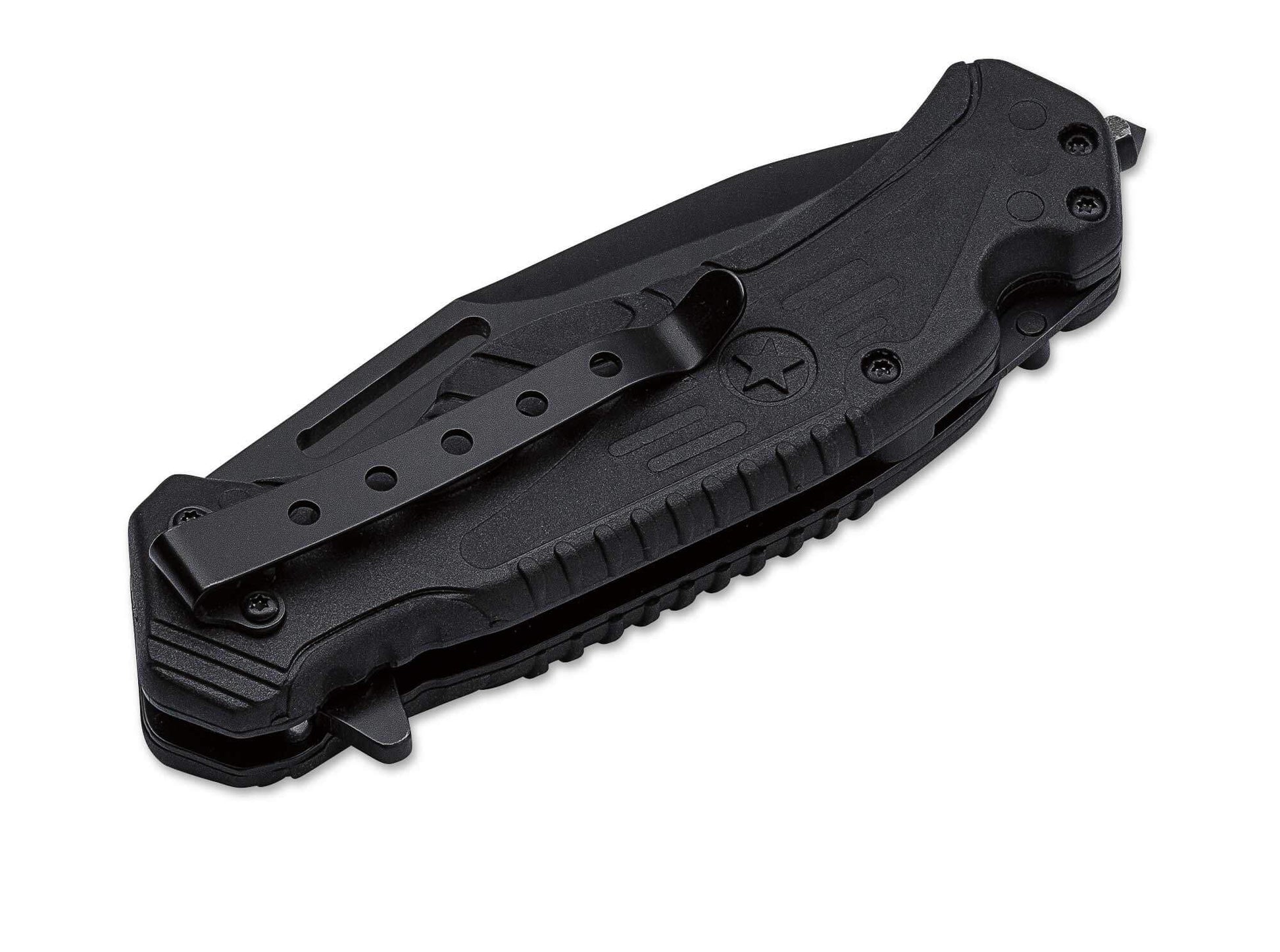 'The Boker Plus Savior rescue knife series is designed for private users who want reliable equipment for helping themselves or others in an emergency, as well as for professionals who carry a rescue tool on the job. Solid steel liners support fiberglass-reinforced plastic scales that have overmolded black TPR rubber inlays in strategic areas to improve grip even in wet, cold, or high-stress situations. A replaceable glass breaker on the pommel reliably shatters side windows, and a retractable belt cutter lets you cut straps close to the body without risking injury. The blade has a flipper and partial serration, the knives include a removable tip-down pocket clip, and they ship with a premium nylon belt pouch.'