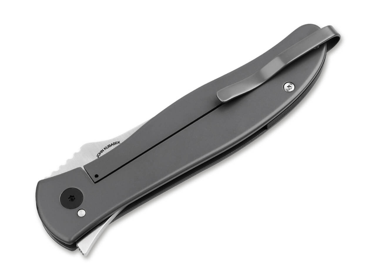 'Discreet in looks but uncompromising in performance, knifemaker John Kubasek of Massachusetts has designed an exclusive everyday companion: the Boker Plus The Escort. Its satin-finished, straight-back Nitro-V blade rides on ball bearings and opens quickly with the flipper. A reliable framelock keeps the blade secure, while pronounced jimping on the thumb ramp and the gently curved grey stainless-steel handle provide excellent grip and safety. The tip-up deep-carry clip keeps the knife low-profile, complemented by a black pivot screw that echoes the style of bodyguard sunglasses. It comes with a quality nylon case for storage. The Boker Plus The Escort — ready when it matters.'
